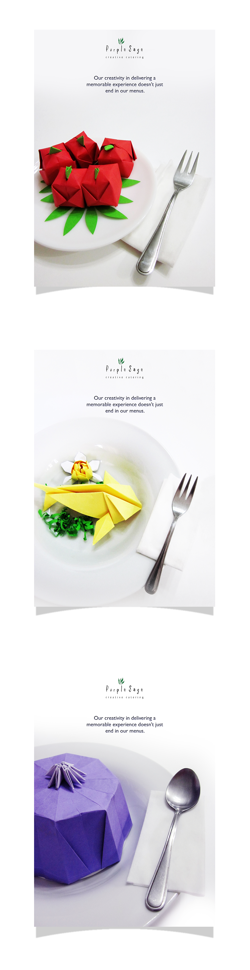 The main concept for this advertisement is to use origami to bring out the uniqueness that catering service Purple Sage provides. It is a metaphor to represent the creative, innovative catering service that the company strives for. Origami-folding is tedious and requires a lot of patience and sensitivity to details, reflecting the brand's values: patience, dedication and passion.