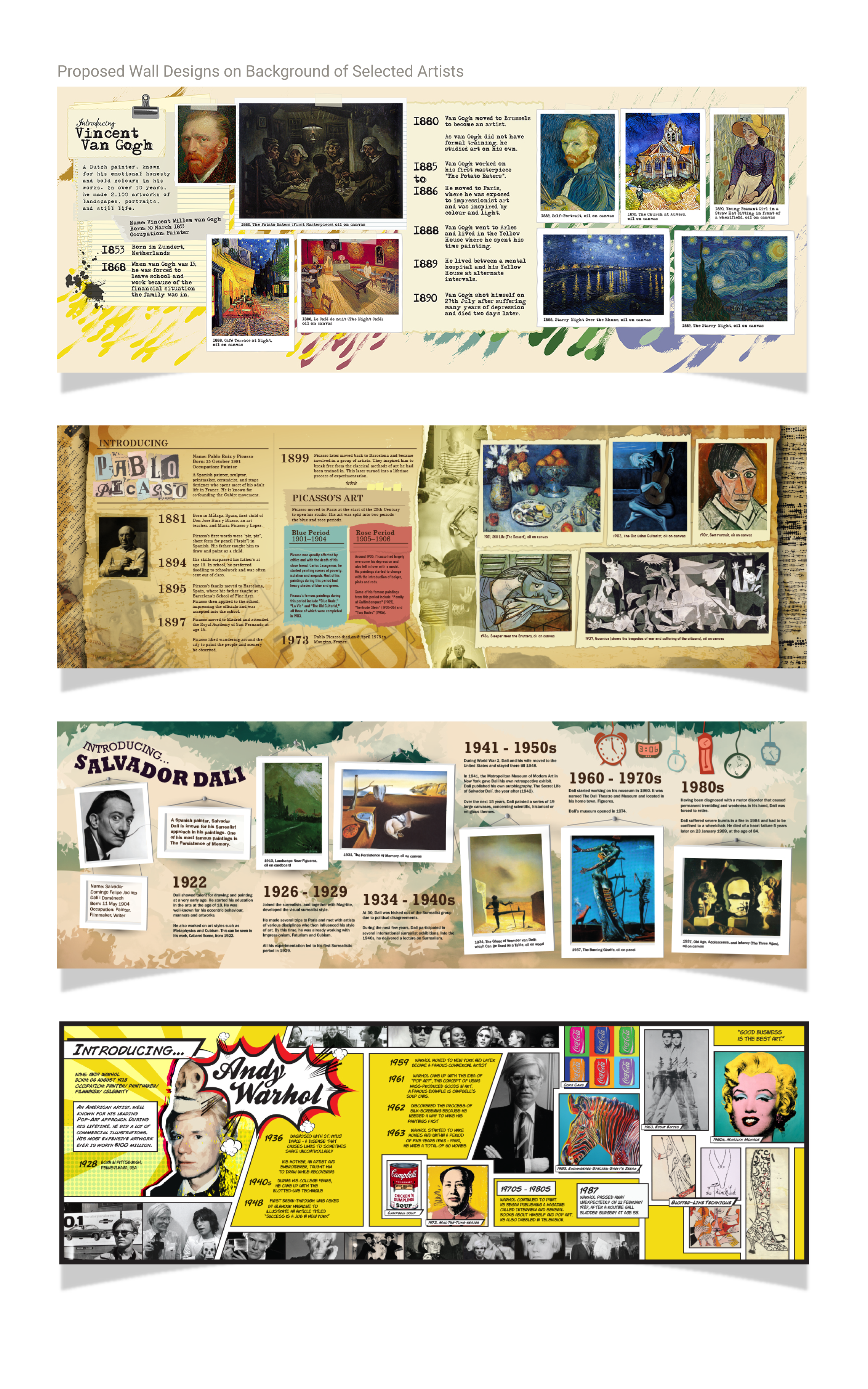 I chose fonts and graphics that represented the art period. For example - I designed Andy Warhol's biography in the form of a comic similar to reflect the pop art movement.