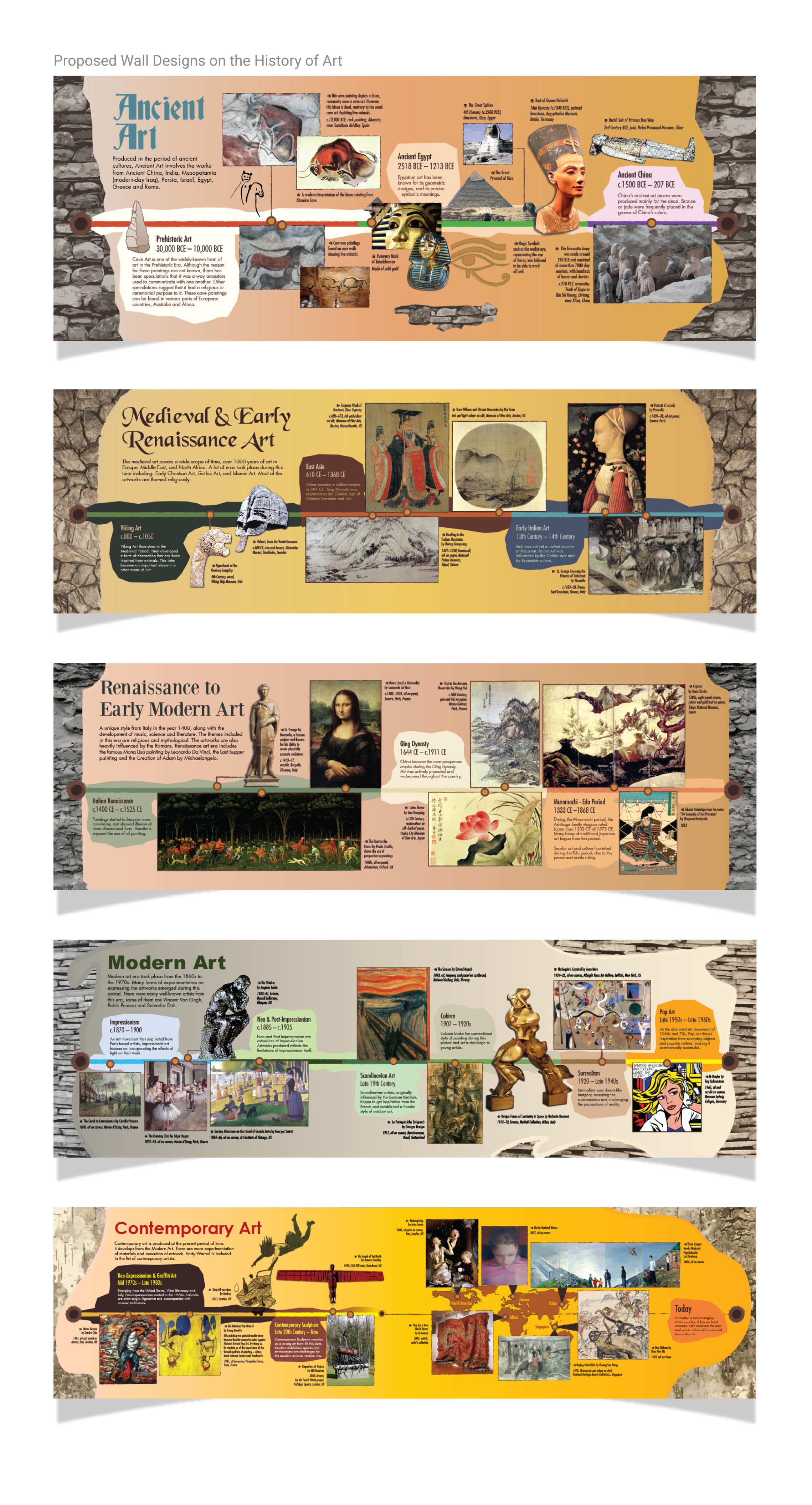 I was more familiar with the history of design and therefore decided to use it to my advantage when selecting the fonts for the various art periods. As the designs will be printed and installed on walls, I chose wall graphics that were similar to the buildings representative of the time period.
